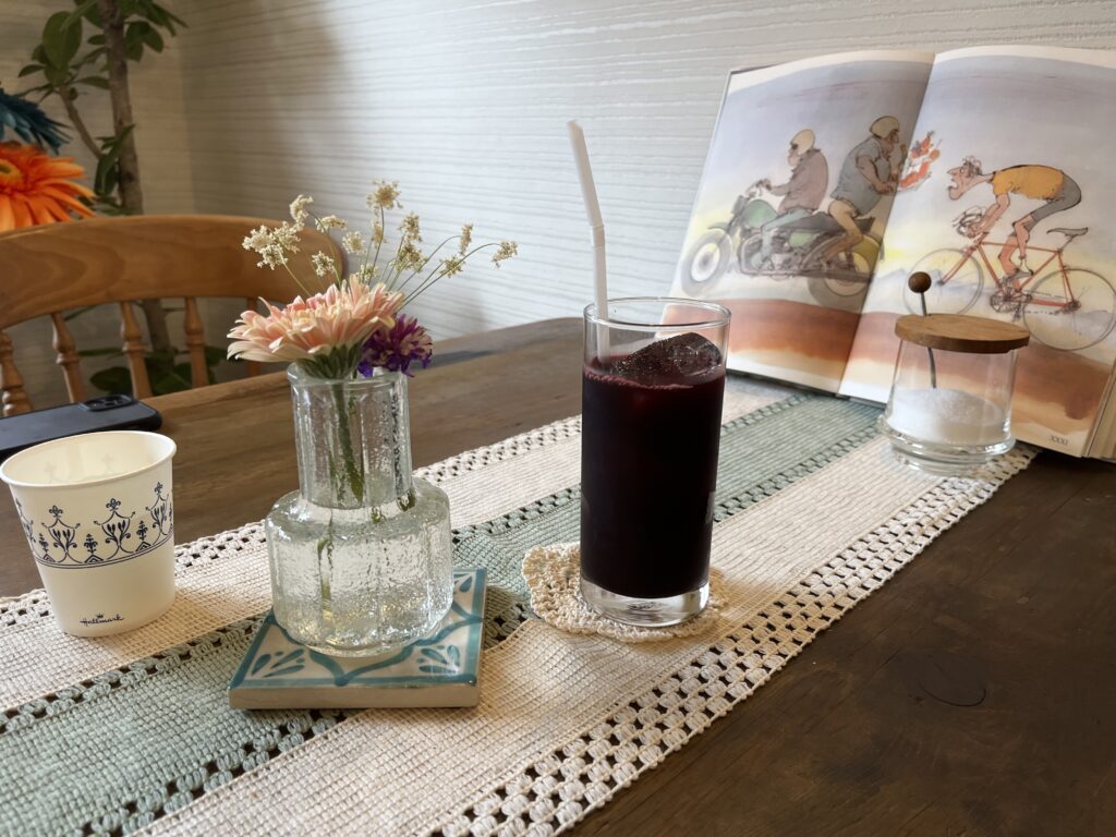 各テーブルには、花が飾られてあります。また席ごとに置いてある小物が違うので、席選びも楽しいです。