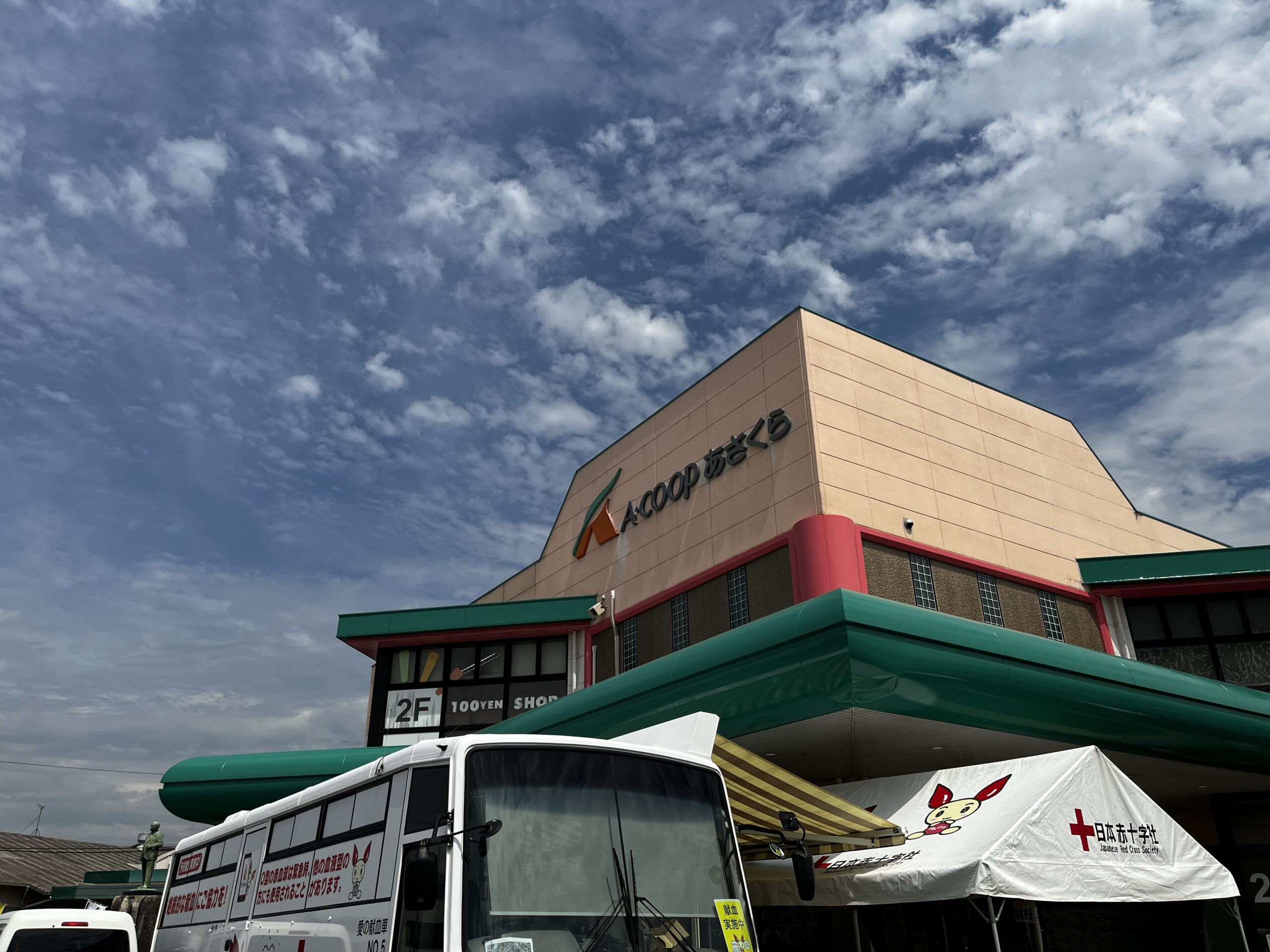 駐車場は半分くらい埋まっています。献血バスも停まっています。