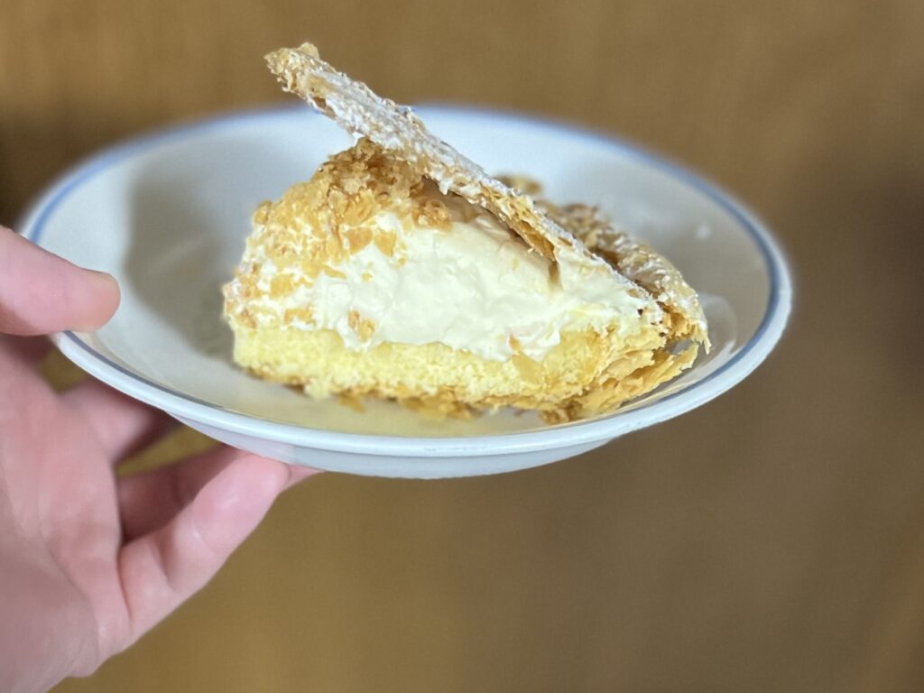 クリームは、生クリームとカスタードクリームを合わせたもの。口に入れた瞬間、「わー贅沢なクリームだ!」と唸りました!!ブランデーが香り重厚感があるのに、食べるとなめらかで、上のパイにも下のパイにもどちらにも合うように計算されています!!めちゃくちゃ美味しいです!!