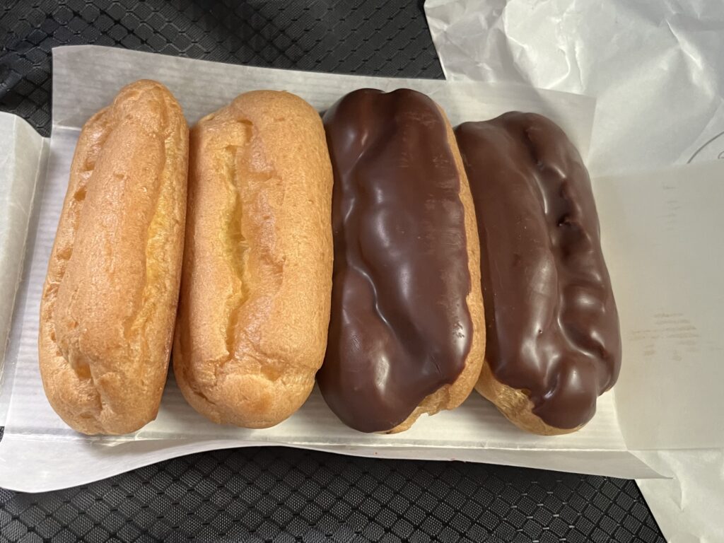 エクレアは、チョコレートがあることによって、甘さはアップし食感には変化が加わって、美味しかったです!!