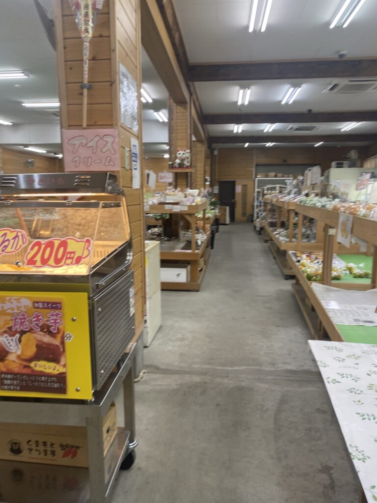入口前には花や野菜の苗、自動ドアの正面には、直方市内や近郊で採れた新鮮・旬のフルーツが陳列されている棚が、どーんと構えています。中央より奥には、これまた直方市内や近郊で採れた新鮮・旬の野菜や加工品などがが並んでいます。壁に沿って置かれているのは冷ケース。