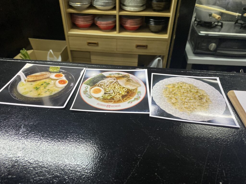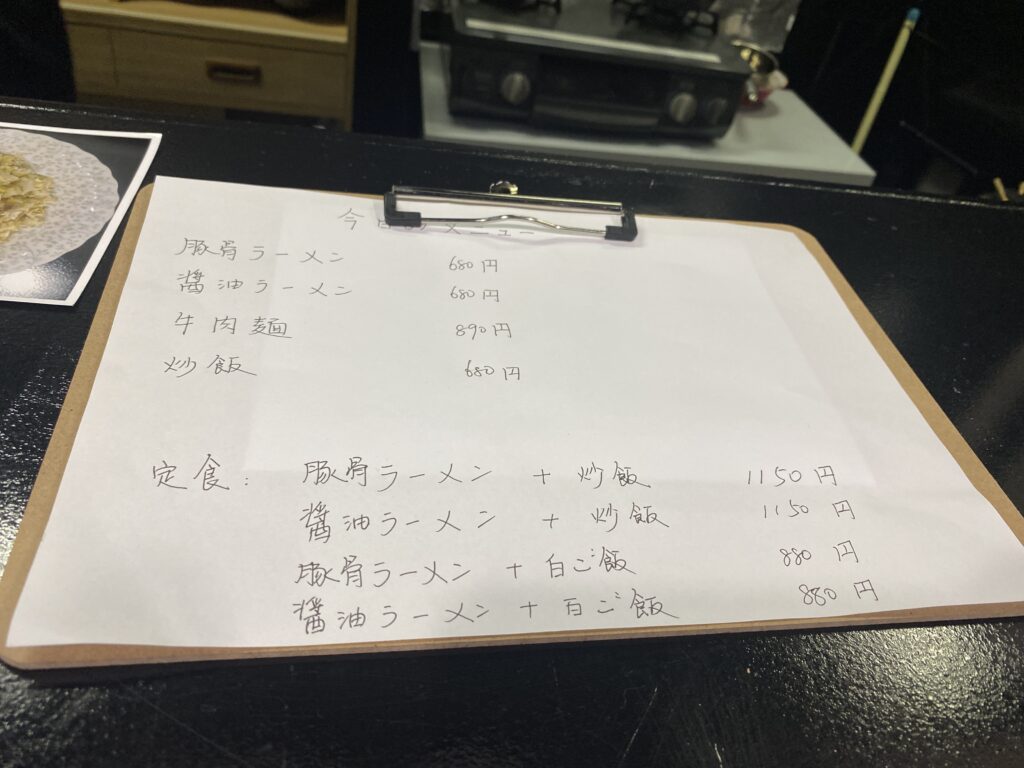「豚骨ラーメン」「醤油ラーメン」「牛肉麺」などが並んでおり、