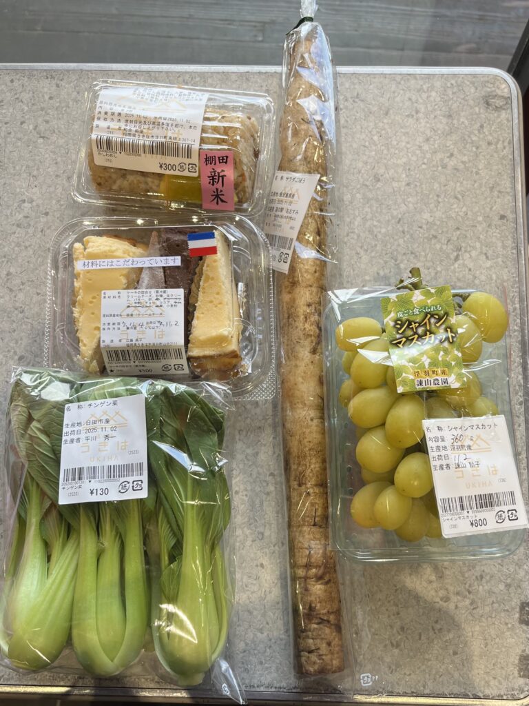 直売所スペースには、野菜や果物、お惣菜などがたくさん並んでいます。うきは市はフルーツの産地と言われているだけあって、果物の販売面積が広い印象を受けました。そこには、ぶどうや柿など旬の果物がたくさん並んでいます!!そしてみなさん、次から次へと手に取って行かれます!!