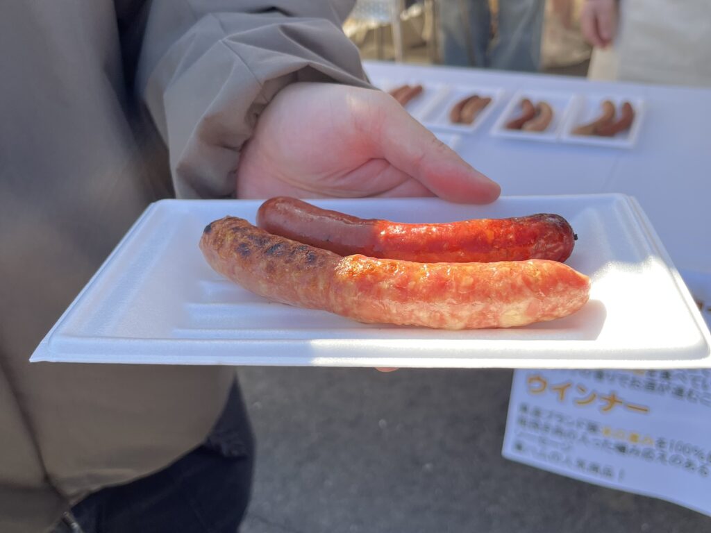 放牧牛入りのウインナー(濃茶)とポークウインナー(茶)の2種盛りです。