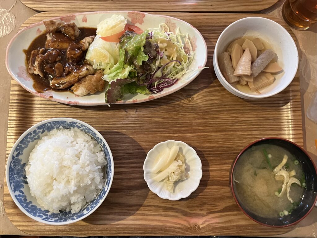 ご飯、お味噌汁、小鉢(この日はたけのこの煮物に至るまで期待を裏切らないクオリティーo(*≧∀≦*)o