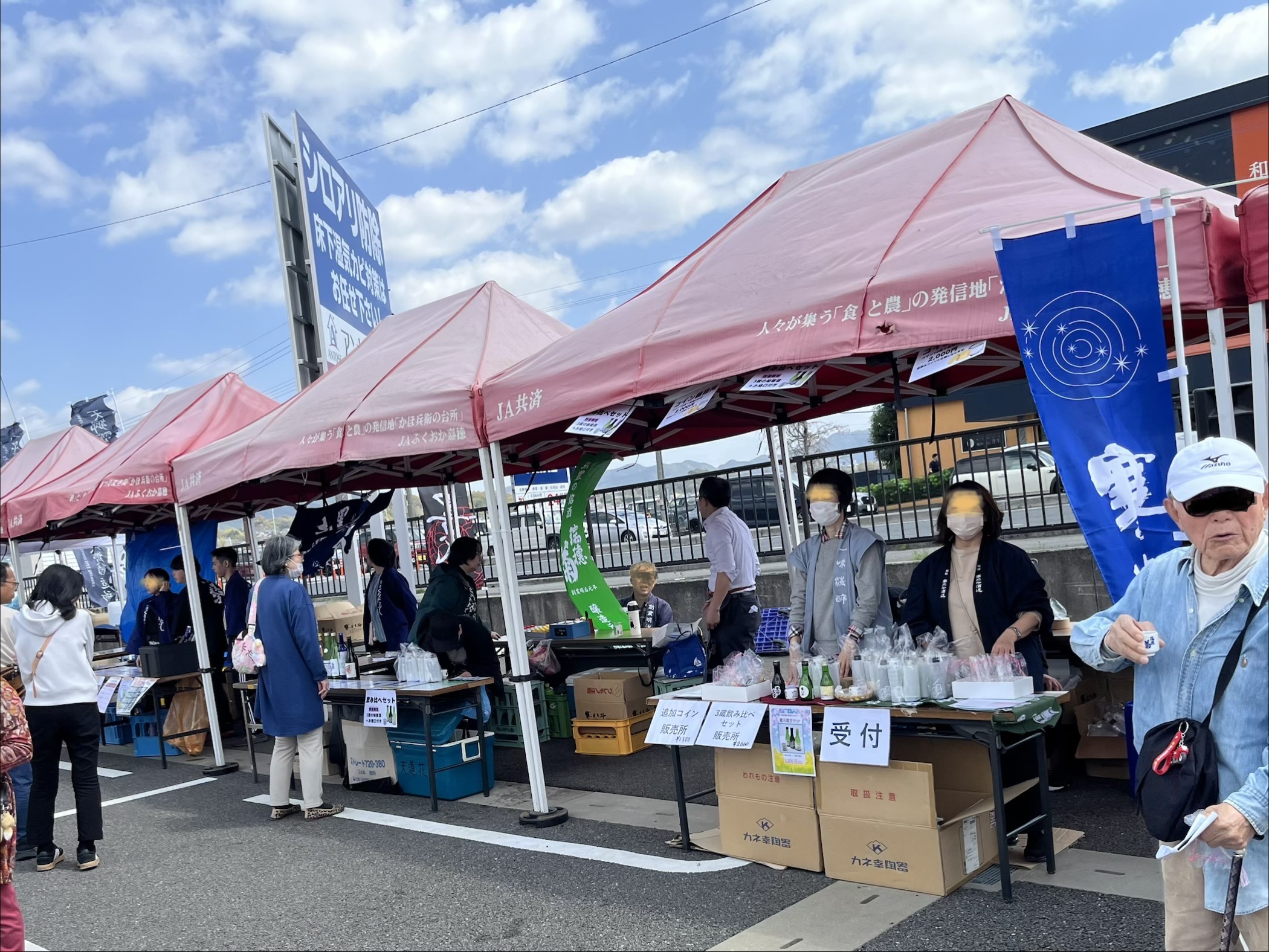 駐車場の一部分に、テントとキッチンカーがまるで円陣を組んでいるかのように並んでいます。